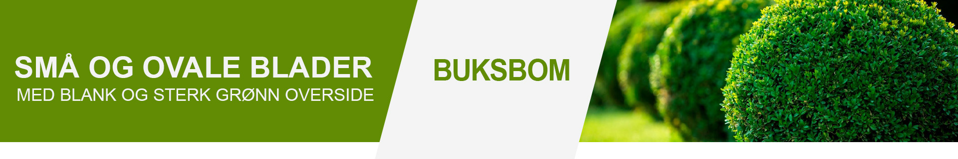 Buksbom er en klassisk, vintergrønn plante som egner seg svært godt til lave hekker, kantplanting og formklippede figurer i hagen. Buksbom har små, ovale blader med blank og sterkt grønn overside og matt underside, og får uanselige små gulgrønne blomster. Den tette veksten og de fine bladene gjør buksbom spesielt godt egnet der du ønsker en formell, stram og dekorativ struktur.