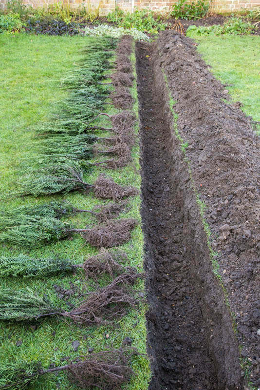 Gjør gjerne klarte en grøft/plantegrop der hekken skal stå, og plant i vei. Grøften bør være 30 cm dyp og 25 cm bred. Forbedre jorda med kugjødselkompost (på våren) eller plantejord.
