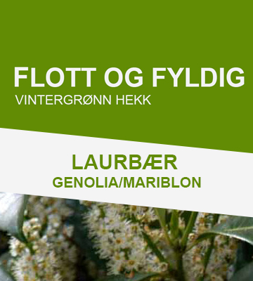 Laurbærhegg 'Genolia Mariblon' (PRUNUS L. GENOLIER-A / MARIBLON) er en flott vintergrønn hekkplante. ’Genolia Mariblon’ får flotte store, ovale, skinnede mørkegrønne blader som gir en frodig fylde. ’Genolier’ Mariblon er meget oppreist i veksten, og derfor er denne typen kirsebærlaurbær best egnet til å stå som uklippet hekk. Hvis du likevel ønsker å holde den klippet, er dette den hekktypen som vil gi deg minst arbeid med klipping på grunn av veksten. Blir opp til 3,5 meter hvis du ikke klipper. ’Genolia Mariblon’ blir ikke tynn i bunnen kan stå oppreist i snøen pga. de sterke grener. Våre laurbærplanter en relativt hardføre og kan plantes i kystområdene på Sør- og Vestlandet. Herdighetssone: H3 Antall planter pr. meter: 2