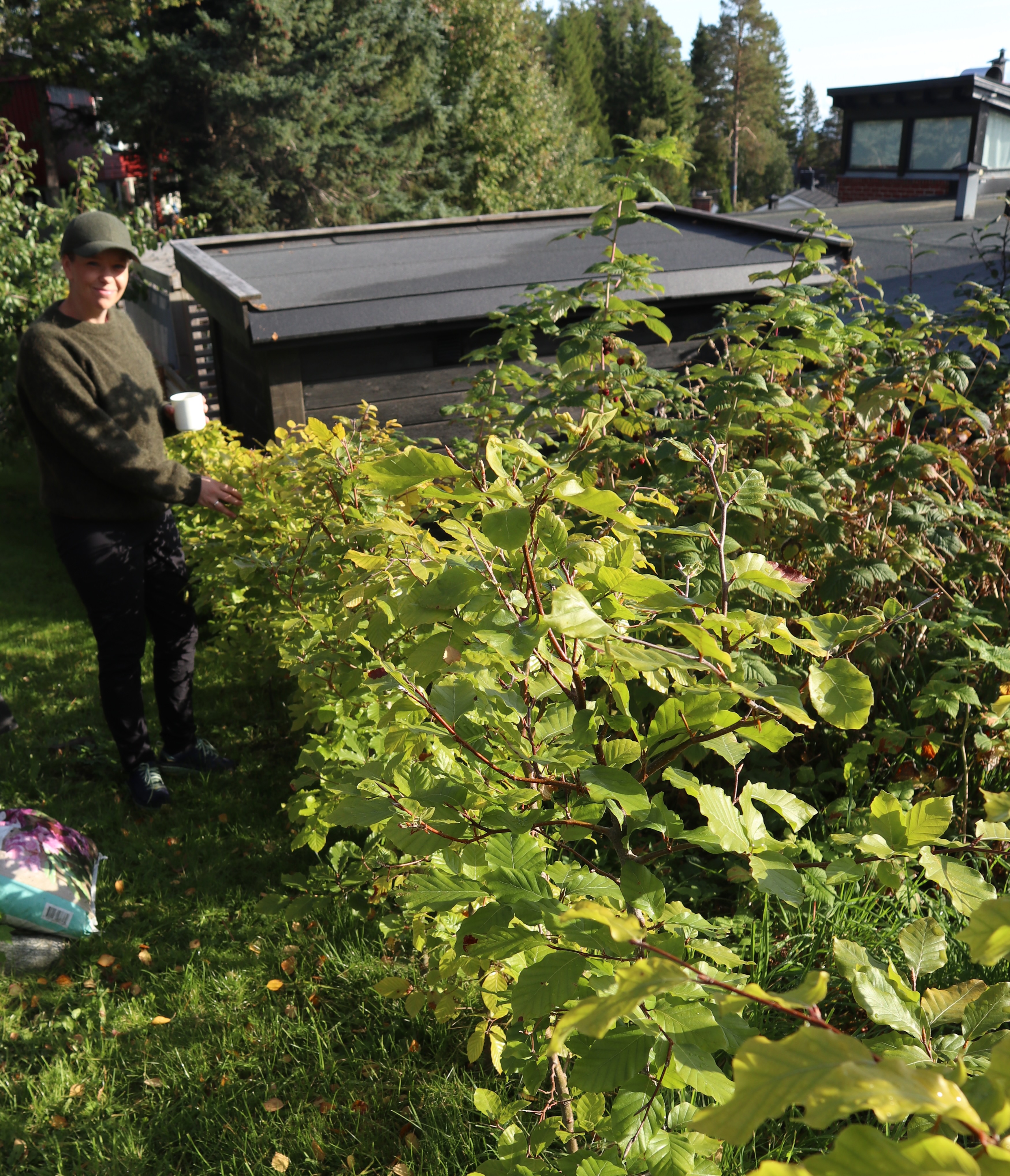 «Jeg er så glad vi valgte bøkehekk og ekstra glad for at vi valgte planter i potte. Vi gjorde jo alt selv, og det tok sin tid å grave 60 meter grøft i dette vanskelige terrenget med stein og trerøtter over alt,» sier Annfrid og peker rundt på det delvis bratte terrenget.